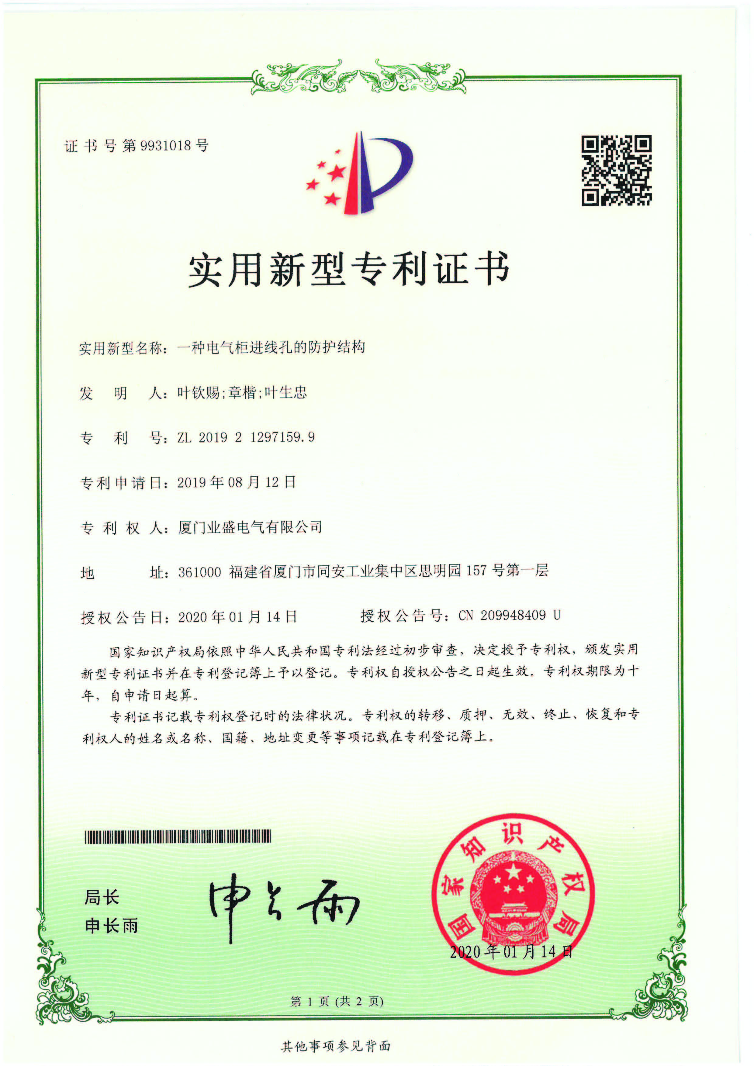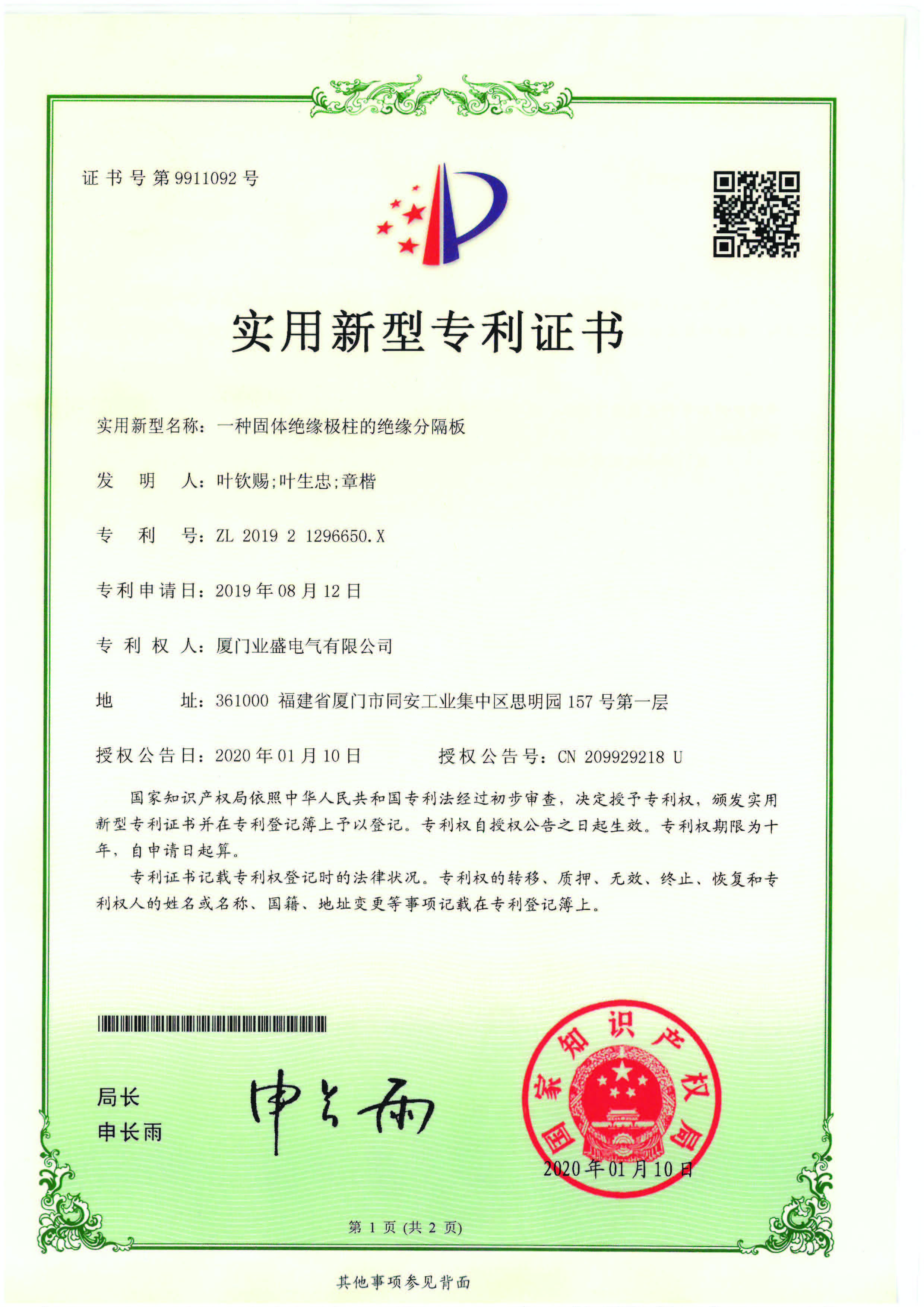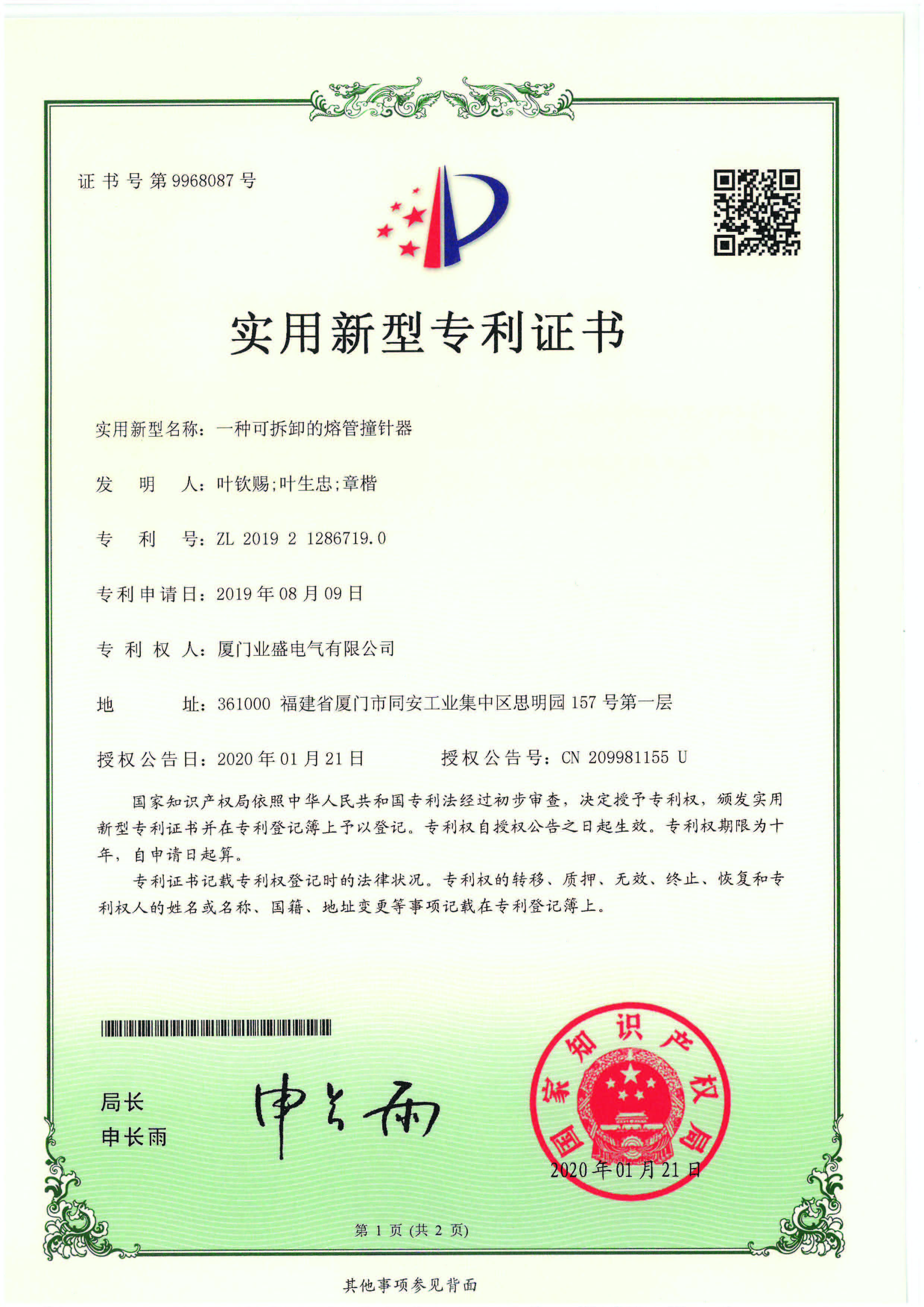 實(shí)用新型專(zhuān)利證書(shū)