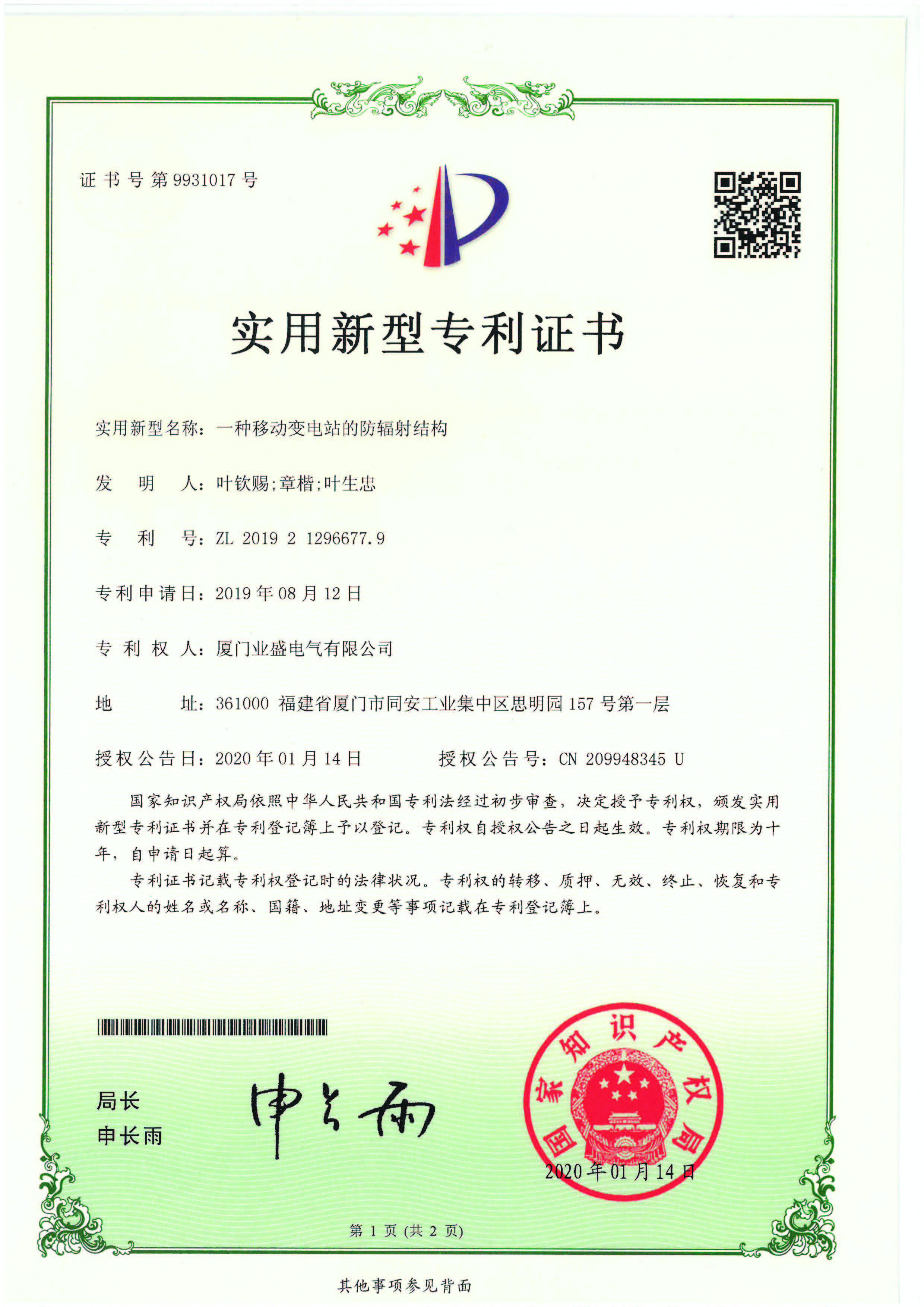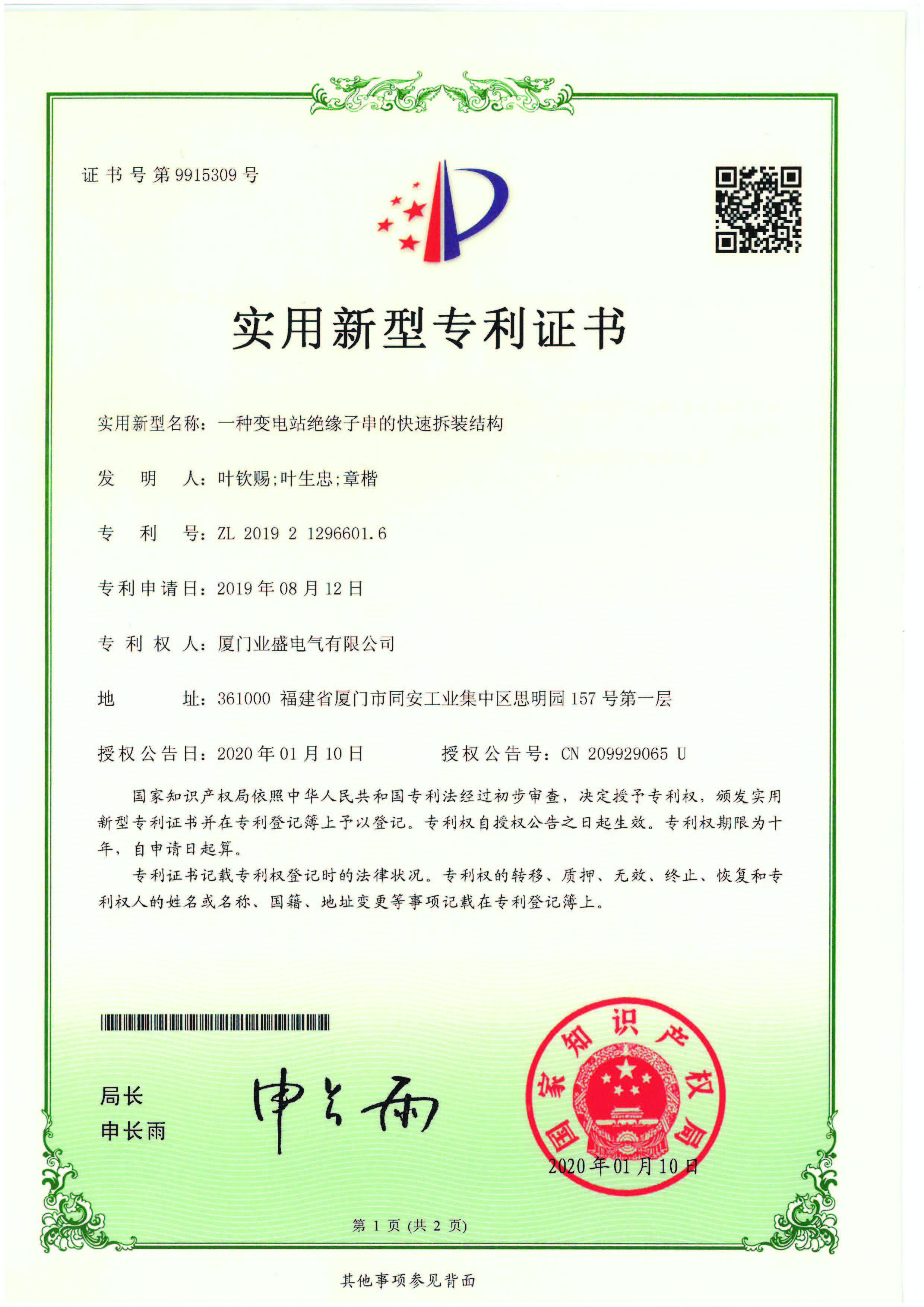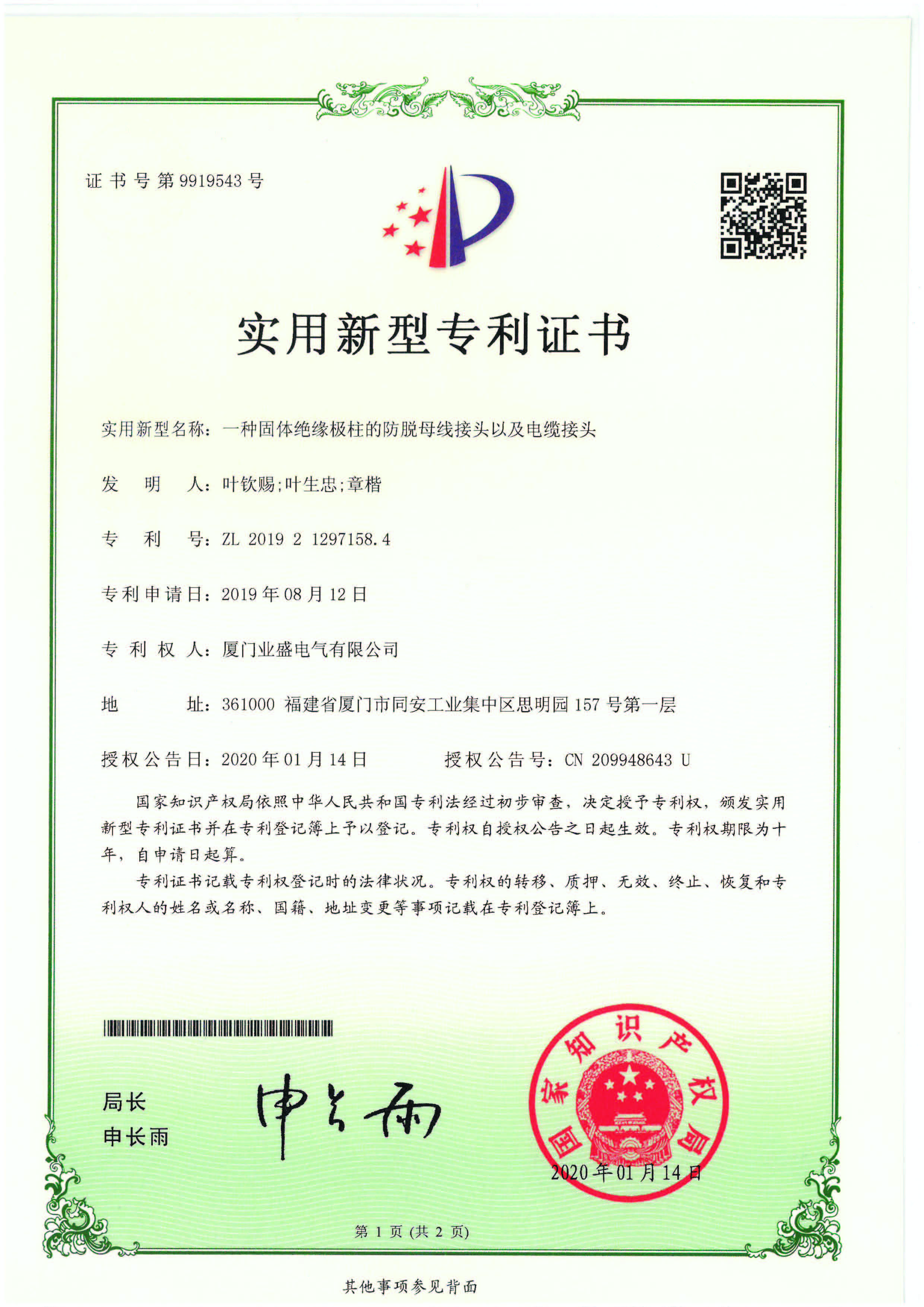 實(shí)用新型專(zhuān)利證書(shū)